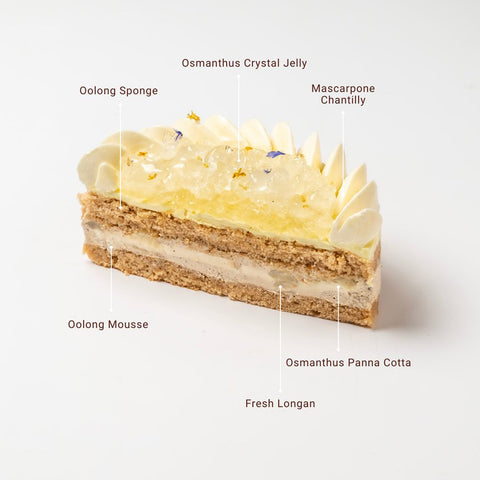 Light, fragrant, and elegant — our Osmanthus Oolong Cake is specially crafted for those who appreciate gentle flavors and heartfelt moments. Featuring layers of oolong mousse, osmanthus panna cotta, soft oolong sponge, and fresh longan, it’s a refined treat that feels just like a warm hug.